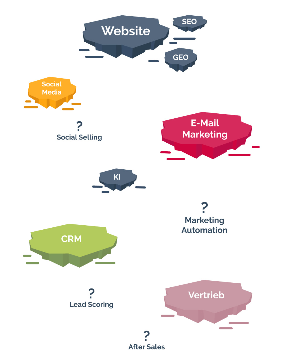 Wir nennen das „Insellösungen“. Einzelne Werkzeuge – oder eben gar keine – die für sich alleine stehen wie kleine Inseln. Ohne Brücken dazwischen.